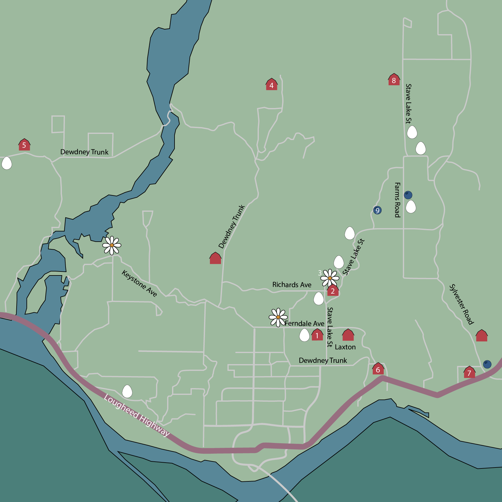 This map was put together based on call outs to farms as well as signs on the roads. More information is available on local farms and food makers below.